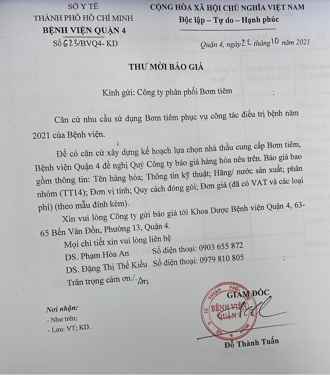 Bệnh viện Quận 4 mời báo giá bơm tiêm phục vụ công tác điều trị năm 2021.