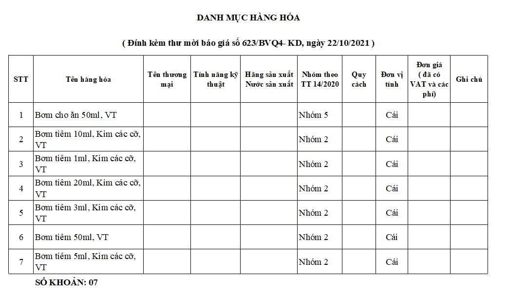 Thư mời báo giá bơm tiêm phục vụ công tác điều trị năm 2021