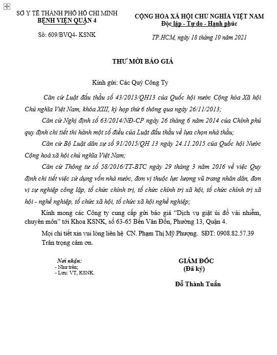 Thư mời báo giá dịch vụ giặt ủi đồ vải