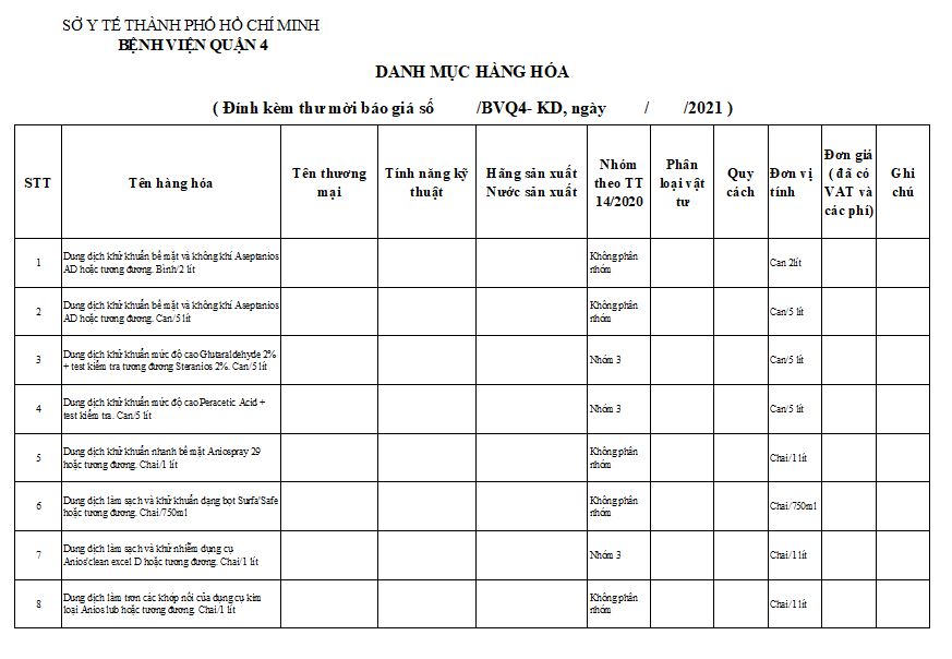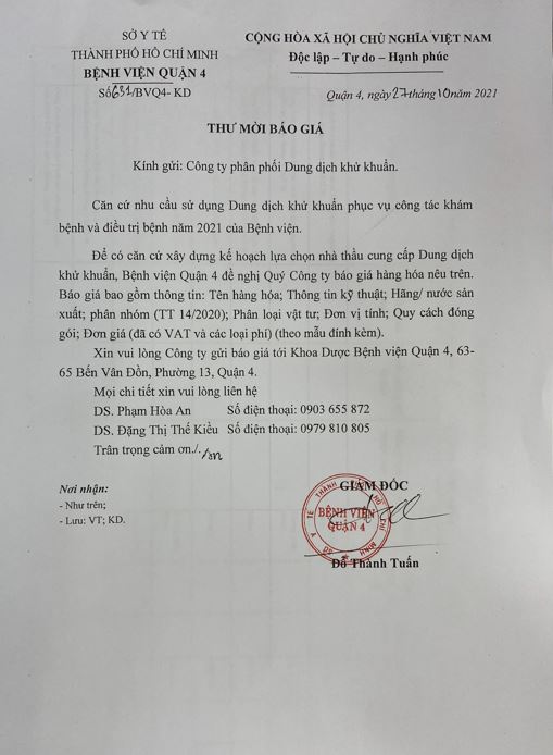 Bệnh viện Quận 4 mời báo giá dung dịch khử khuẩn