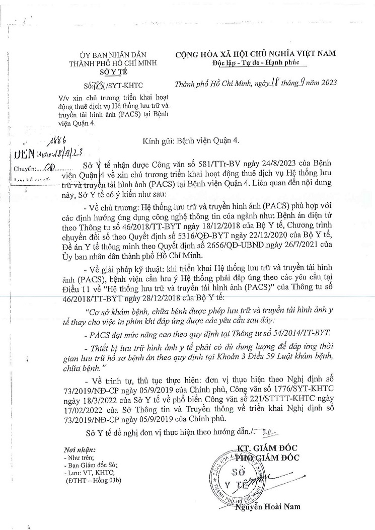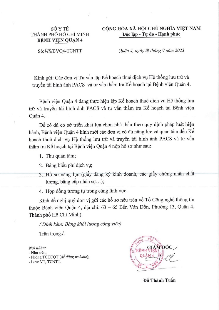 Thư mời chào giá Tư vấn lập kế hoạch thuê dịch vụ Hệ thống lưu trữ và truyền tải hình ảnh PACS và tư vấn thẩm tra kế hoạch tại Bệnh viện Quận 4