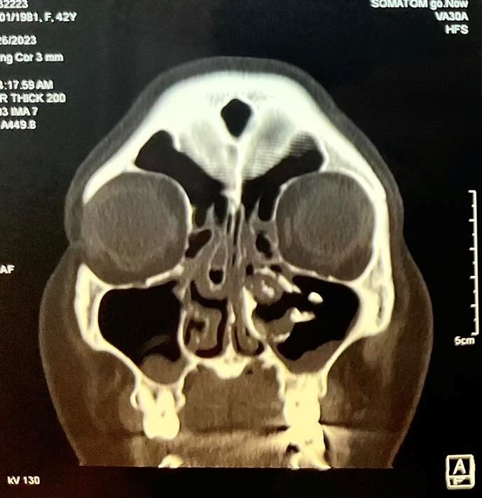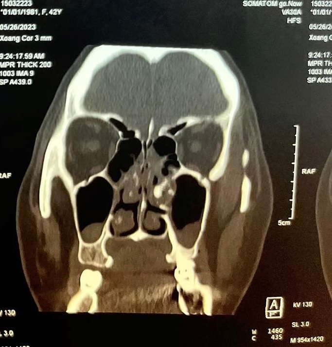 Gần đây bệnh nhân xuất hiện thêm đau nhức vùng mắt trái cùng bên nên đã đến khám tại Bệnh viện Quận 4. Qua nội soi thăm khám và thực hiện chụp CT-Scan phát hiện bệnh nhân có cấu trúc mật độ giống xương dính vào thành trong xoang hàm bên trái, đẩy lệch vách mũi xoang về phía vách ngăn gây hẹp hốc mũi bên trái kèm viêm xoang hàm sàng 2 bên và concha bullosa cuốn mũi giữa bên phải gây tắc nghẽn đường dẫn lưu của xoang hàm bên phải
