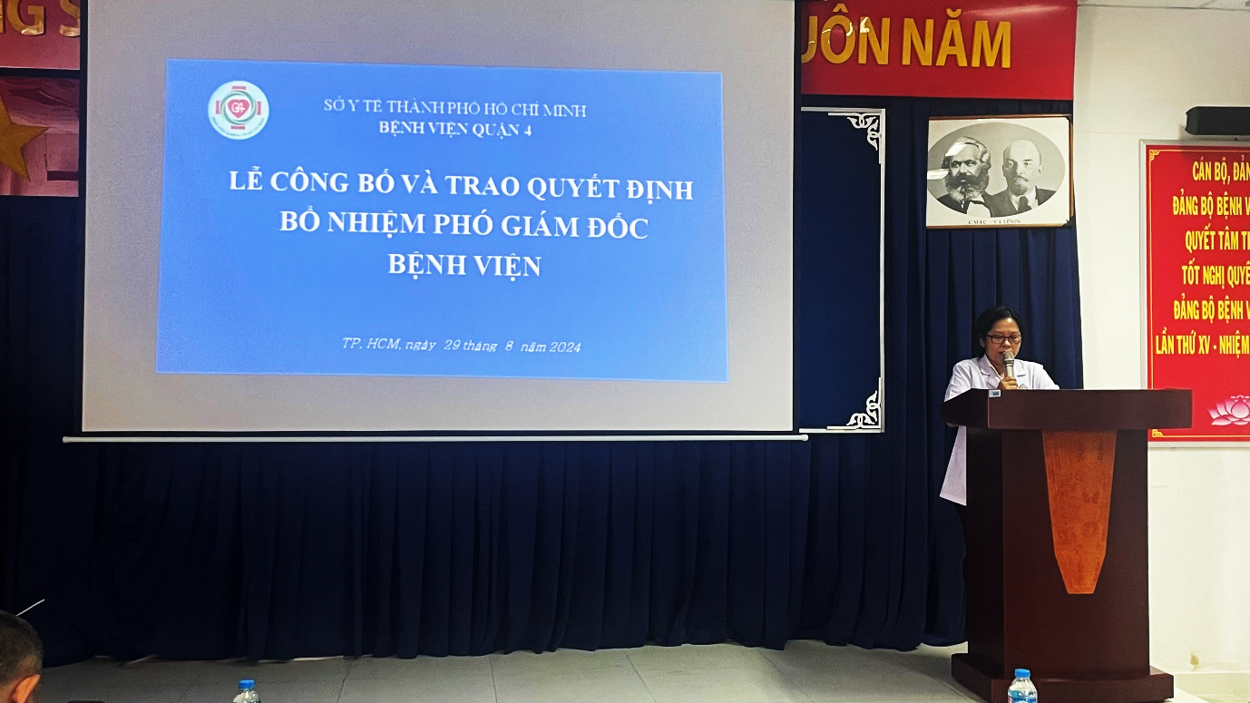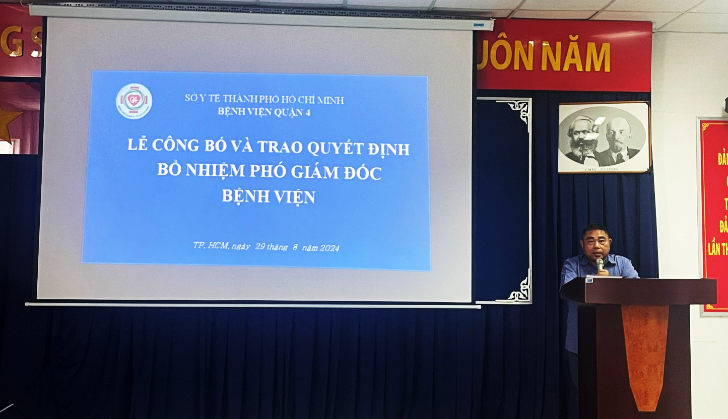 Sáng ngày 29 tháng 8 năm 2024, tại Hội trường Bệnh viện Quận 4, Sở Y tế đã công bố quyết định bổ nhiệm Phó Giám đốc Bệnh viện Quận 4 (Bệnh viện hạng II) trực thuộc Sở Y tế Thành phố Hồ Chí Minh.