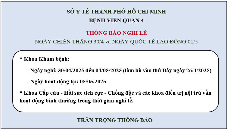 Bệnh viện Quận 4 kính gửi lịch nghỉ lễ Ngày Chiến thắng 30/4 và Quốc tế Lao động 01/5 như sau: