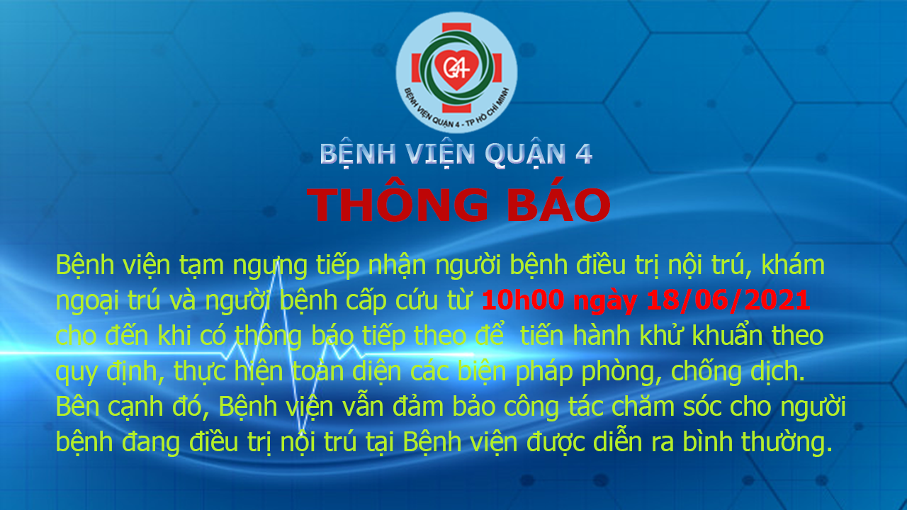 Bệnh viện tạm ngưng tiếp nhận người bệnh điều trị nội trú, khám ngoại trú và người bệnh cấp cứu từ 10h00 ngày 18/06/2021 cho đến khi có thông báo tiếp theo để tiến hành khử khuẩn theo quy định, thực hiện toàn diện các biện pháp phòng, chống dịch.
